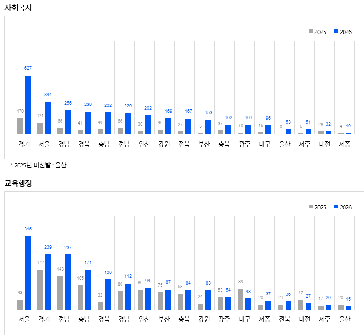 사회복지 수요 급증 및 지자체별 인력 재배치 등이 맞물려 반영된 결과로 풀이된다. (2026년 3월까지 발표 기준)