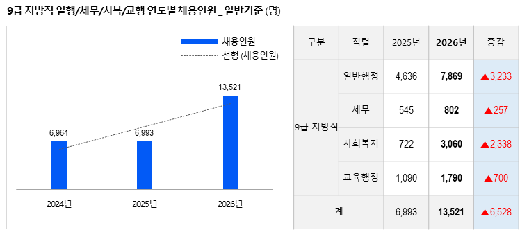 2026년 9급 지방직 채용의 핵심은 4개 주요 직렬의 고른 선발 확대와 사회복지직의 대폭 증원이다.