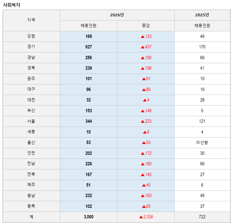 사회복지직은 2026년 채용인원이 전년 722명에서 올해 3,060명으로 무려 4배 이상 채용 규모가 커졌다.