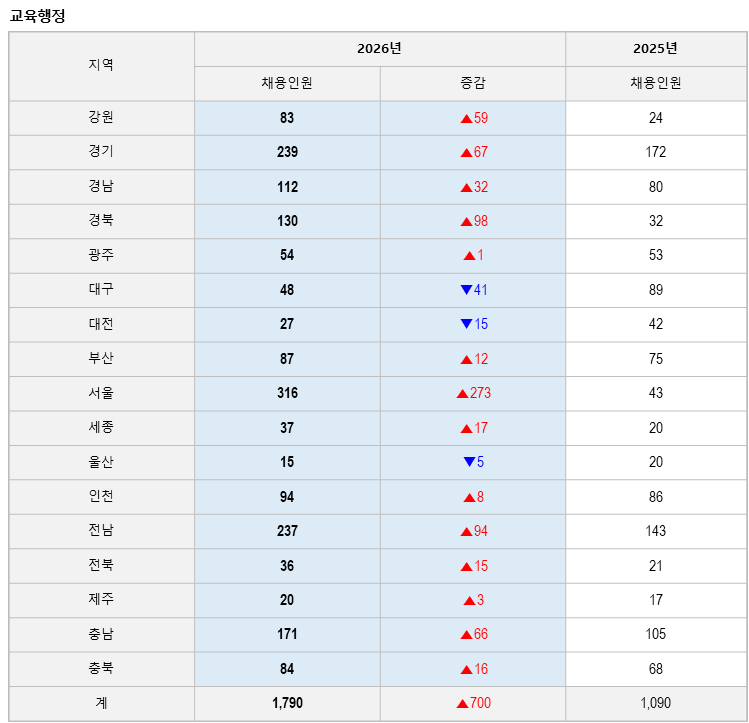 교육행정직 역시 채용인원이 늘었으며 2026년에 작년 보다 700명 늘어난 1,790명을 선발한다.