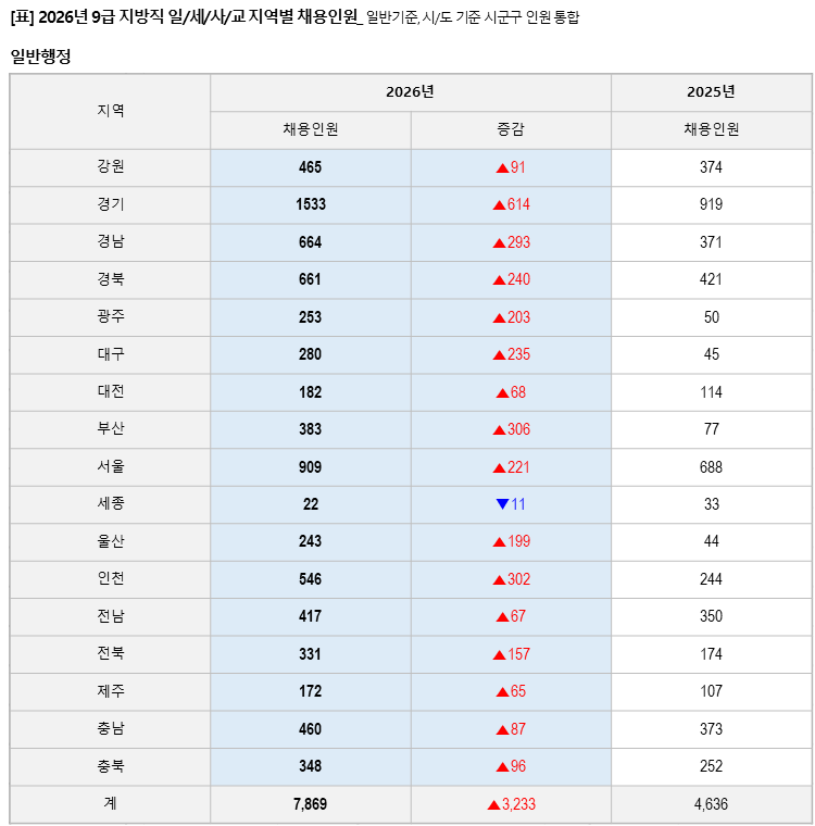 일반행정직은 총 7,869명을 선발하며 전년 대비 3,233명이 늘어났다.